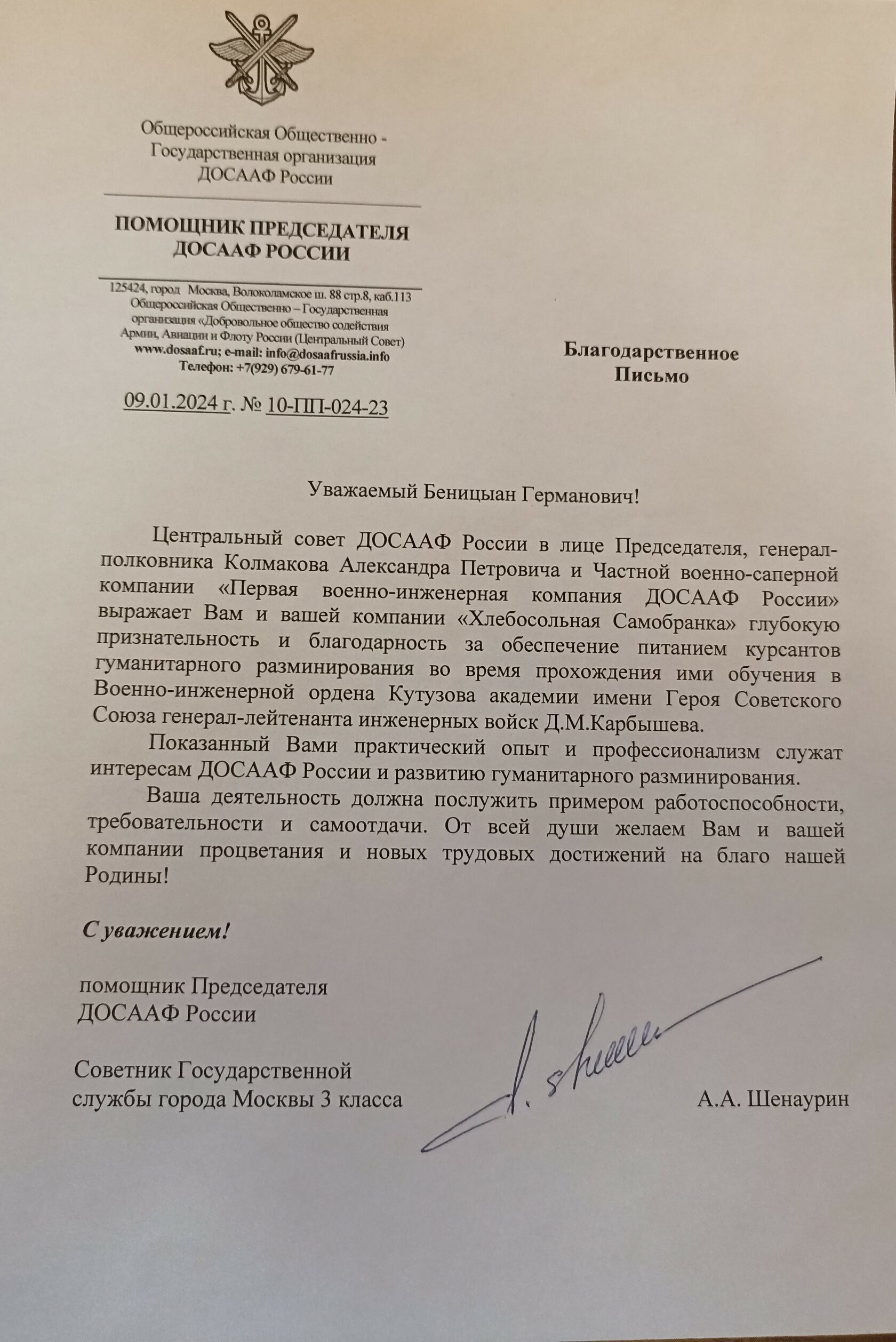 Центральный совет ДОСААФ России в лице Председателя, генерал-полковника Колмакова Александра Петровича и Частной военно-саперной компании выражает Вам глубокую признательность и благодарность за обеспечение питанием курсантов гуманитарного разминирования во время прохождения ими обучения в Военно-инженерной академии ордена Кутузова им. Героя Советского Союза генерал-лейтенанта инженерных войск Д.М. Карбышева.