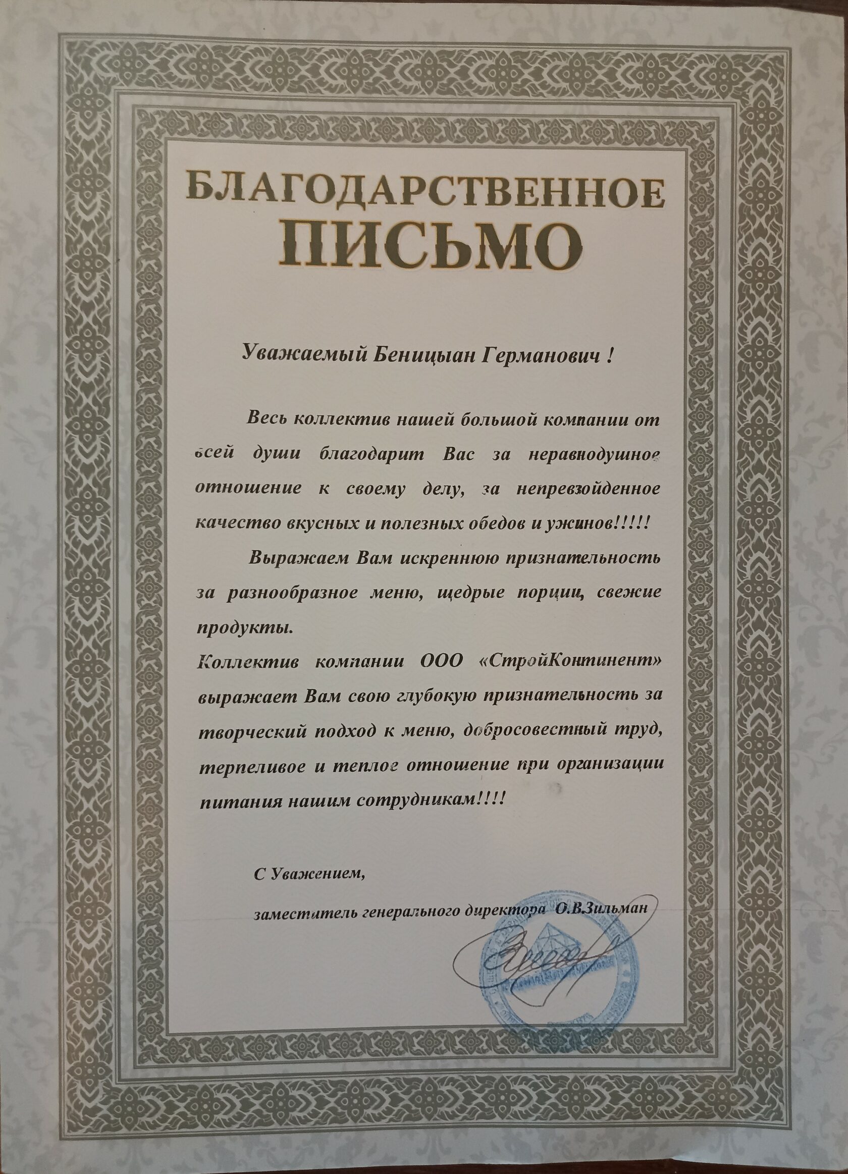Весь коллектив нашей большой компании от всей души благодарит Вас за неравнодушное отношение к своему делу, за непревзойденное качество вкусных и полезных обедов и ужинов. Выражаем Вам искреннюю признательность за разнообразное меню, щедрые порции, свежие продукты. Коллектив компании ООО “Стройконтинент” выражает Вам свою глубокую признательность за творческий подход к меню, добросовестный труд, терпеливое и теплое отношение при организации питания нашим сотрудникам.