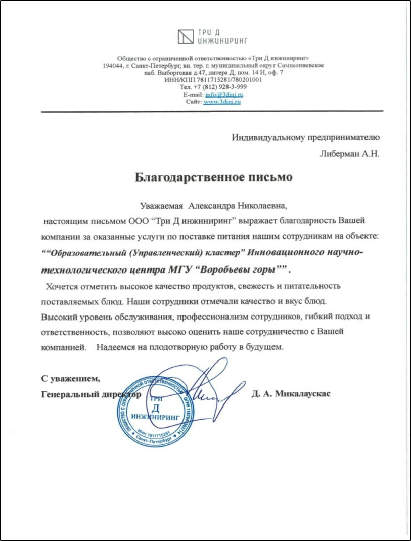 Настоящим письмом ООО “Три Д Инжиниринг” выражает благодарность Вашей компании за оказанные услуги по поставке питания нашим сотрудникам. Хочется отметить высокое качество продуктов, свежесть и питательность поставляемых блюд. Высокий уровень обслуживания, профессионализм сотрудников, гибкий подход и ответственность, позволяют высоко оценить наше сотрудничество с Вашей компанией.